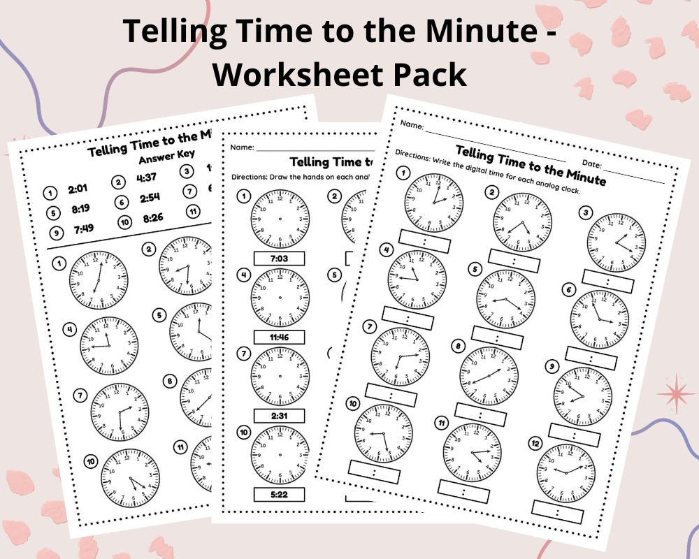 Draw the hands on analog clocks and write the digital time to practice telling time to the minute.
